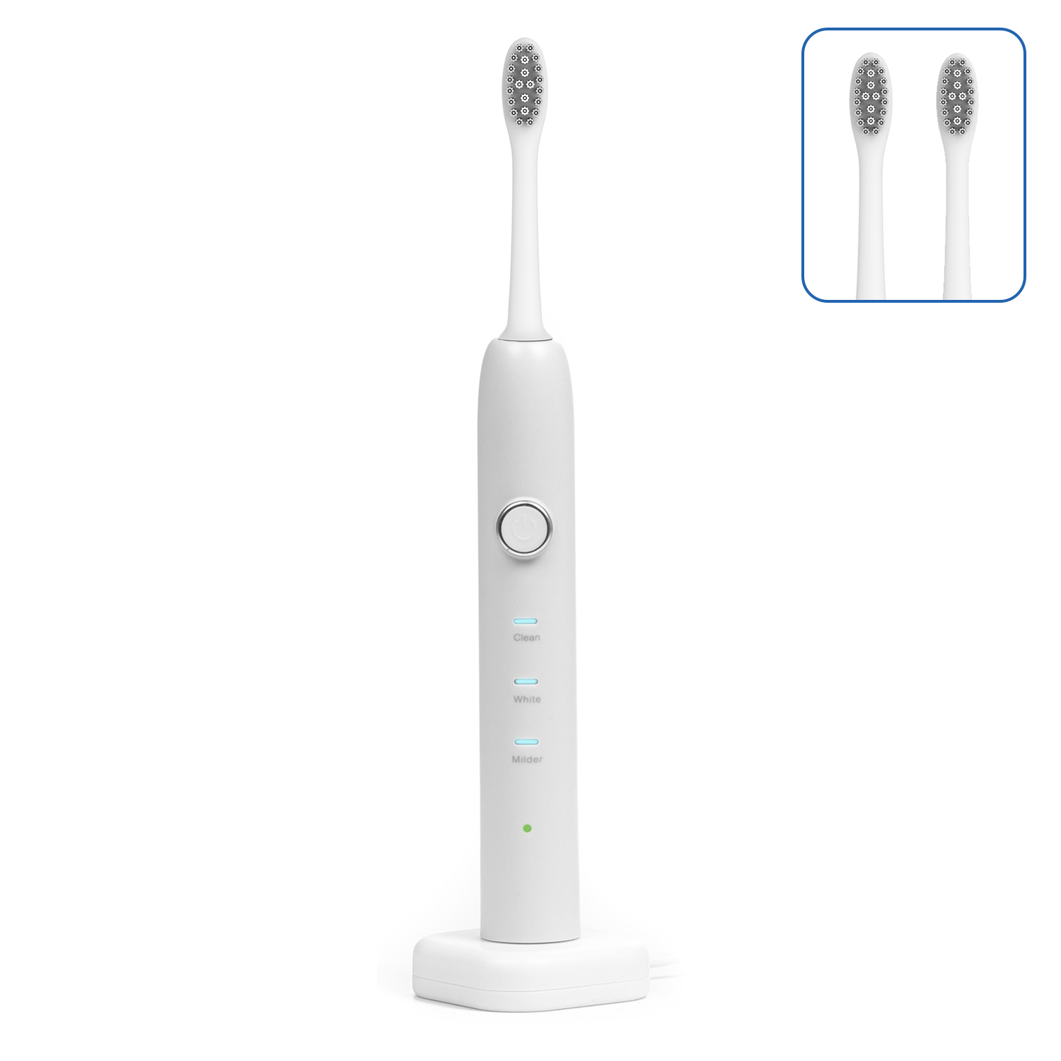 Brosse à dents électrique avec batterie rechargeable et tête. 3 modes d'utilisation. Chargement sans fil inductif. • Fréquence de vibration jusqu'à 36 000 tours par minute. • Rappel intelligent après 2 minutes d'utilisation. • Complètement étanche pour un nettoyage facile après utilisation. • Trois modes d'utilisation différents : nettoyage, blanchiment et sensible. • Chargement sans fil inductif, avec base de chargement USB. • Témoin de charge.