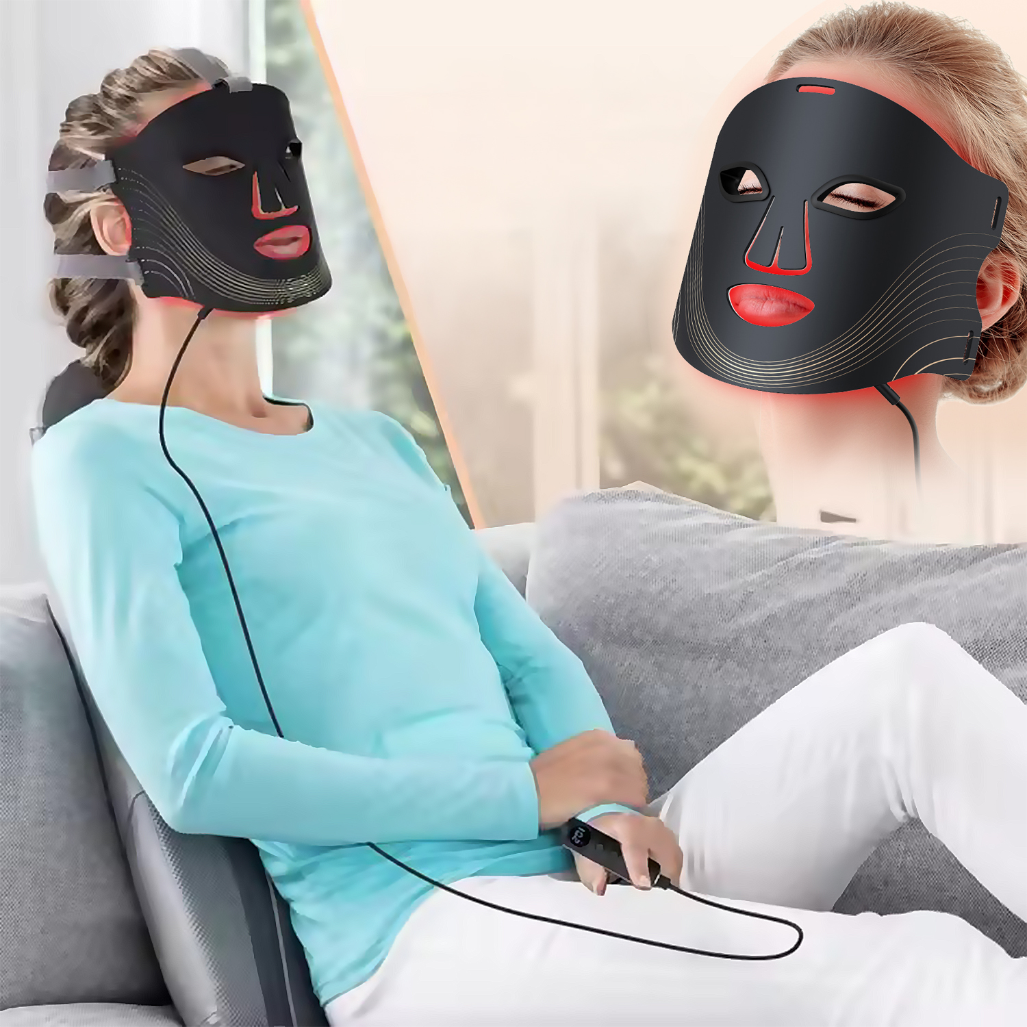 • Batterie rechargeable intégrée, avec temporisateur d'utilisation de 5-10-15-20 minutes et télécommande avec intensité lumineuse réglable, en plus ce masque est équipé d'un système de chauffage entre 38-42°C.
