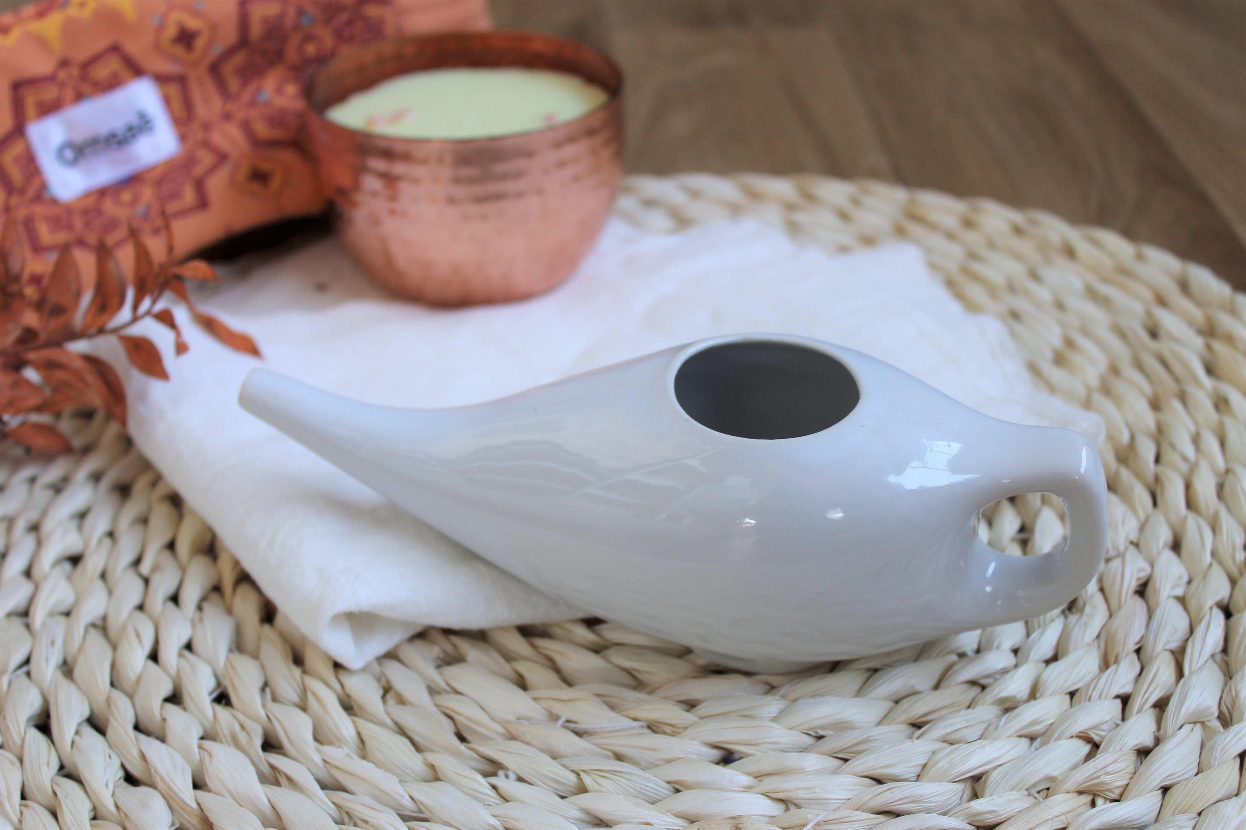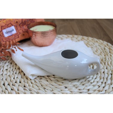 Pot Neti en céramique de couleur blanche avec un bec verseur long et fin. Accessoire indispensable en Ayurveda pour le rituel matinal appelé Dinacharya, le pot neti permet de nettoyer le nez de manière naturelle pour éliminer les impuretés accumulées telles que les traces de pollution mais également de décongestionner et irriguer le nez. Il est conseillé en usage quotidien ou ponctuel pour apprécier ses effets détoxifiants !