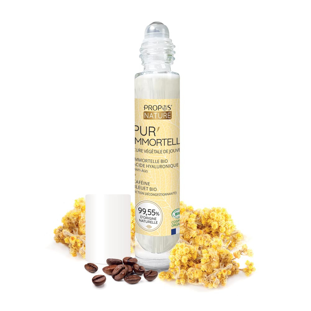 Aqua, Helichrysum Italicum flower water*, Centaurea Cyanus flower water*, Glycerin**, Propanediol, Helianthus annuus seed oil***, Helichrysum Italicum flower extract*, Helichrysum Italicum flower oil*, Caffeine, Sodium hyaluronate, Parfum, Xanthan gum, Tocopherol, Sodium benzoate, Potassium sorbate, Citronellol, Geraniol, Linalool, Limonene. 99,55% des ingrédients sont d ?origine naturelle dont 27.88% sont *issus de l ?agriculture biologique. **fabriqués à partir d ?ingrédients biologiques.***fabriqués à partir d ?ingrédients biologiques et non biologique. Certifié par Bureau Veritas selon le référentiel Cosmos Standard disponible sur le site www.cosmos standard.org