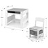 DIMENSIONS : Dimensions de la table : L 61,5 x L 61,5 x H 48,5 cm Hauteur jusqu'à la tablette inférieure de la table : 37 cm Dimensions du compartiment de rangement sous le plateau : L 59,5 x L 25,5 x H 8 cm Dimensions du compartiment de rangement latéral : L 54,5 x H 16,5 x P 6,5 cm Épaisseur du plateau : 12 mm Dimensions de la chaise : L 28,5 x L 31 x H 53 cm Hauteur d'assise : 27 cm Dimensions du coffre de rangement : L 25,5 x L 24 x H 12 cm Charge maximale de la chaise : 35 kg Charge maximale de la table : 35 kg Poids net : 17,5 kg