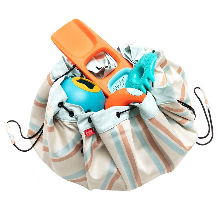 Ce modèle dispose en plus d'une sangle idéal pour porter le sac même très rempli en revenant de la plage, d'un pic nique..etc dans le plus grand confort. Léger, ce sac de rangement / tapis de jeu est idéal également pour emmener ces jouets facilement dans ses déplacements. Motif : imprimé ""stripes"" Dimension : diamètre 140 cm Matière : 90 % polyester - 10% TPU Nous recommandons le passage en machine en cycle délicat. La température ne devra pas excéder 30°C. Ne pas utiliser de détergeant et ne pas frotter. Séchage à plat (sèche linge interdit). Les couleurs peuvent s'éclaircir un peu. Si vous souhaitez conserver l'éclat nous recommandons avant la première utilisation de placer le sac dans un seau d'eau rempli d'eau et contenant 1 tasse de vinaigre blanc. Le laisser tremper 24h puis séchage à plat. Cette étape aide à fixer les couleurs de votre tapis sac de rangement Play and Go. Garanti 3 ans Ceci n'est pas un jouet...