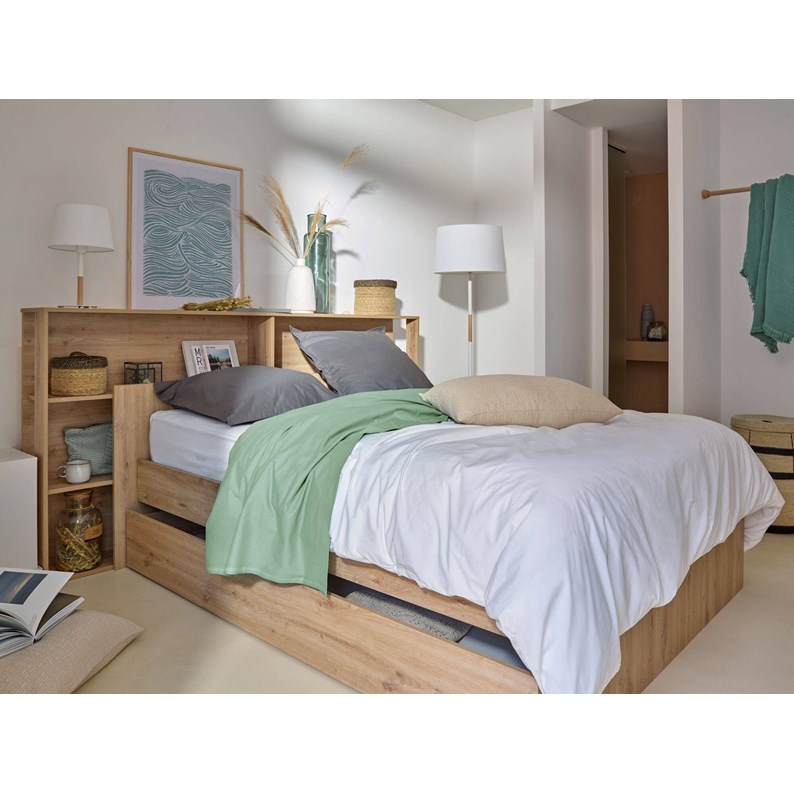 Vous retrouvez des rangements à la fois dans la tête de lit, avec ses niches latérales, idéales pour poser vos objets du quotidien (téléphone, lunettes,...) et ses deux grandes étagères, parfaites pour ajouter des éléments de déco, des livres ou quelques plantes pour appuyer le côté nature. Mais également un grand tiroir sous le lit, où vous pourrez facilement stocker votre linge de lit ou vos habits de saison afin de gagner de la place dans vos placards !