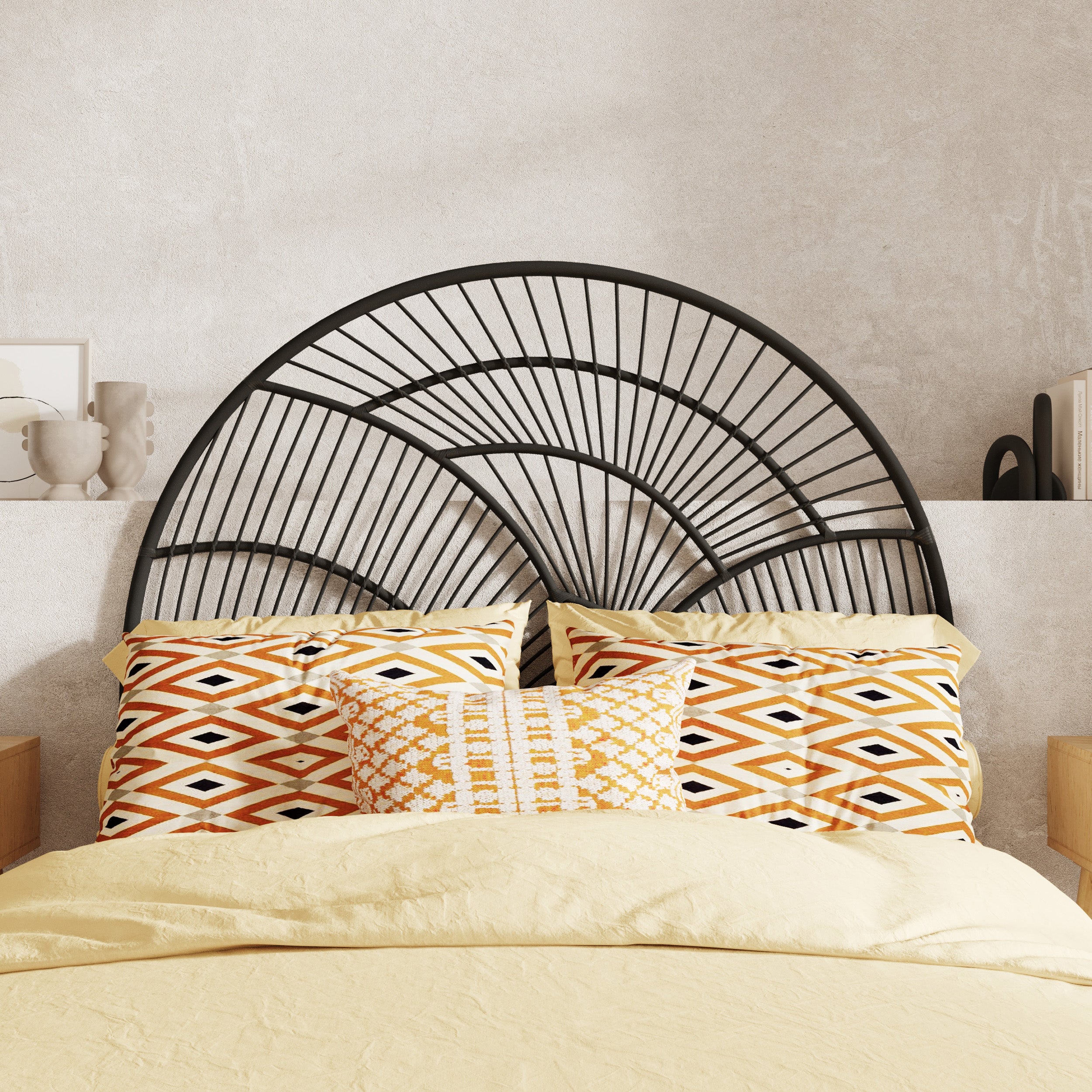 Tête de lit Séléné en rotin noir 140 cm - Ajoutez une touche d'élégance à votre chambre avec la tête de lit Séléné en rotin noir 140 cm. Conçue pour donner du relief et du caractère à votre espace nuit, elle allie douceur et sophistication.Le rotin noir, avec son design artistique, apporte une texture raffinée et une atmosphère contemporaine. Après l'engouement pour notre version en rotin naturel, découvrez Séléné en noir, parfaite pour un style moderne et audacieux.Idéale pour les intérieurs élégants et tendances, cette tête de lit se marie parfaitement avec nos autres meubles. Explorez notre collection et laissez-vous séduire par le charme unique de Séléné.-Contenu : Vendue à l'unitéDimensions : Longueur : 140 cm Profondeur : 3,5 cm Hauteur :140 cmMatière : RotinInfos complémentaires : À poser contre un mur (sans fixation)Montage : Aucun montagePoids produit : 5kgEntretien  : Pour entretenir votre tête de lit en rotin et cannage, dépoussiérez-la régulièrement avec un chiffon doux et nettoyez-la avec un mélange d'eau tiède et de savon doux.Information colis : 143 x 7 x 144 cmRecyclabilité : Non recyclable