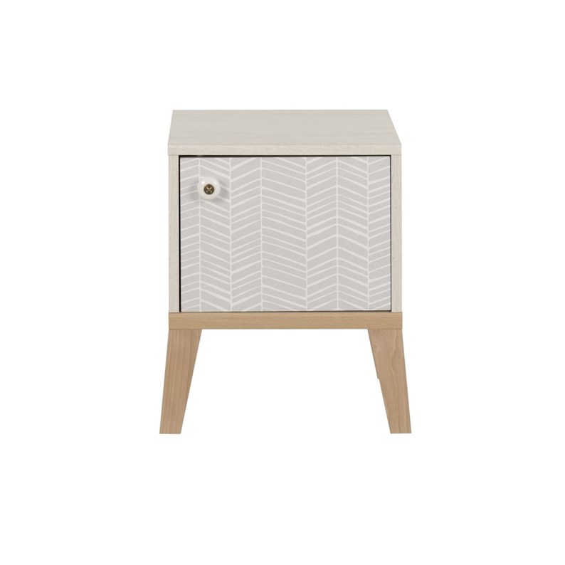 Complétant idéalement le lit issu de la même collection, le chevet junior Gami concilie à merveille élégance et fonctionnalité. Avec sa porte réversible à gauche ou à droite lors de son montage, il pourra se positionner sans difficulté dans n'importe quel recoin de la chambre à coucher. Entre son élégant coloris châtaignier blanchi et hêtre, ses beaux pieds en hêtre massif brut, sa subtile impression grise présente sur sa facade de porte, ou encore son joli bouton en porcelaine avec insert vieux bronze, ce chevet design à l'esprit bohême séduit par ses finitions particulièrement raffinées. Beau chevet avec rangement intégré, il offre un généreux caisson de rangement refermé par une porte permettant ainsi de stocker de nombreux livres et magazines en toute discrétion. D'une largeur de 38 cm et d'une hauteur de 47 cm, le chevet junior Gami occupe un minimum d?espace au sol afin de trouble le moins possible la circulation au sein de la pièce. Sa surface généreuse permettra non seulement l'accueil d'une lampe de chevet mais laissera également toute la latitude de positionner plusieurs cadres photos ou certains petits accessoires déco. Mobilier contemporain aussi chic que pratique, il se rendra utile au moment du coucher tout en participant à instaurer une ambiance design et bohême dans la chambre à coucher.