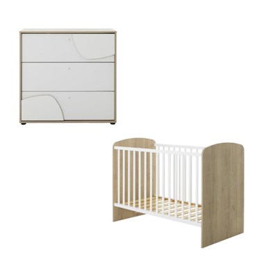 Un joli duo bois et blanc tout en courbes pour créer un cocon de douceur. Ce lit aux dimensions 60x120cm associé à cette commode viendront créer une ambiance naturelle et apaisante pour votre bébé. De jolis arrondis sur la tête et le pied de lit apportent douceur et délicatesse à ce lit. Il est composé de deux barrières à barreaux en bois massif et d'un sommier à lattes. Le sommier est réglable sur deux hauteurs : une position haute pour les nouveaux nés et une position basse quand l'enfant grandit et commence à se mettre debout dans son lit. La commode Basile et ses formes organiques apportent style et douceur à la chambre. Elle offre de beaux volumes et un accès pratique aux affaires du quotidien grâce à ses trois tiroirs. Combinez cette commode avec l'option plan à langer pour créer un meuble 2-en-1 : table à langer et rangement pour les affaires de bébé.