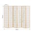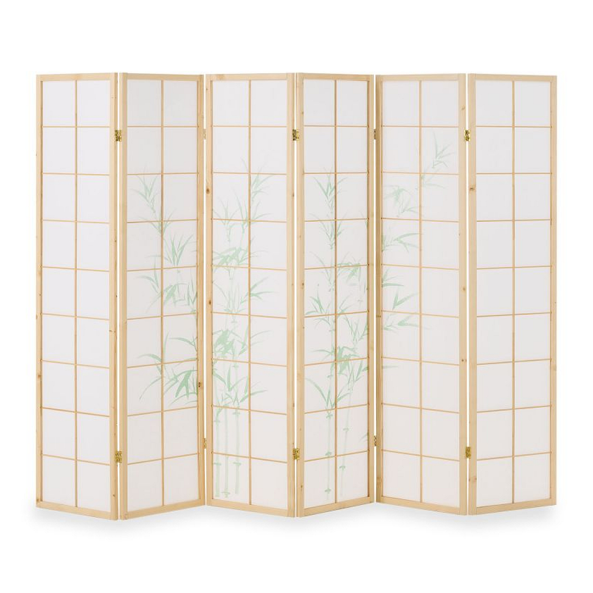 Détails du produit : paravent décoratif à 6 panneaux. cadre en bois clair avec tissu Shoji opaque mais translucide. motif de bambou aquarellé sur la face avant. pliable dans les deux sens grâce à des charnières métalliques stables. utilisation polyvalente : séparation dans la chambre, cloison dans le bureau ou accent décoratif dans le salon. s'intègre parfaitement aux styles d'intérieur modernes, minimalistes et d'inspiration asiatique. mise en place rapide, facile à replier et à ranger. adapté à une utilisation intérieure uniquement. livré entièrement monté Matériaux et couleur : cadre en pin massif naturel. revêtement en papier Shoji translucide avec motif bambou. charnières métalliques solides, pliables dans les deux sens. couleurs : naturel / blanc Dimensions : hauteur : 178,5 cm. largeur dépliée : 264 cm. profondeur : 2,0 cm. largeur de chaque panneau : 44 cm