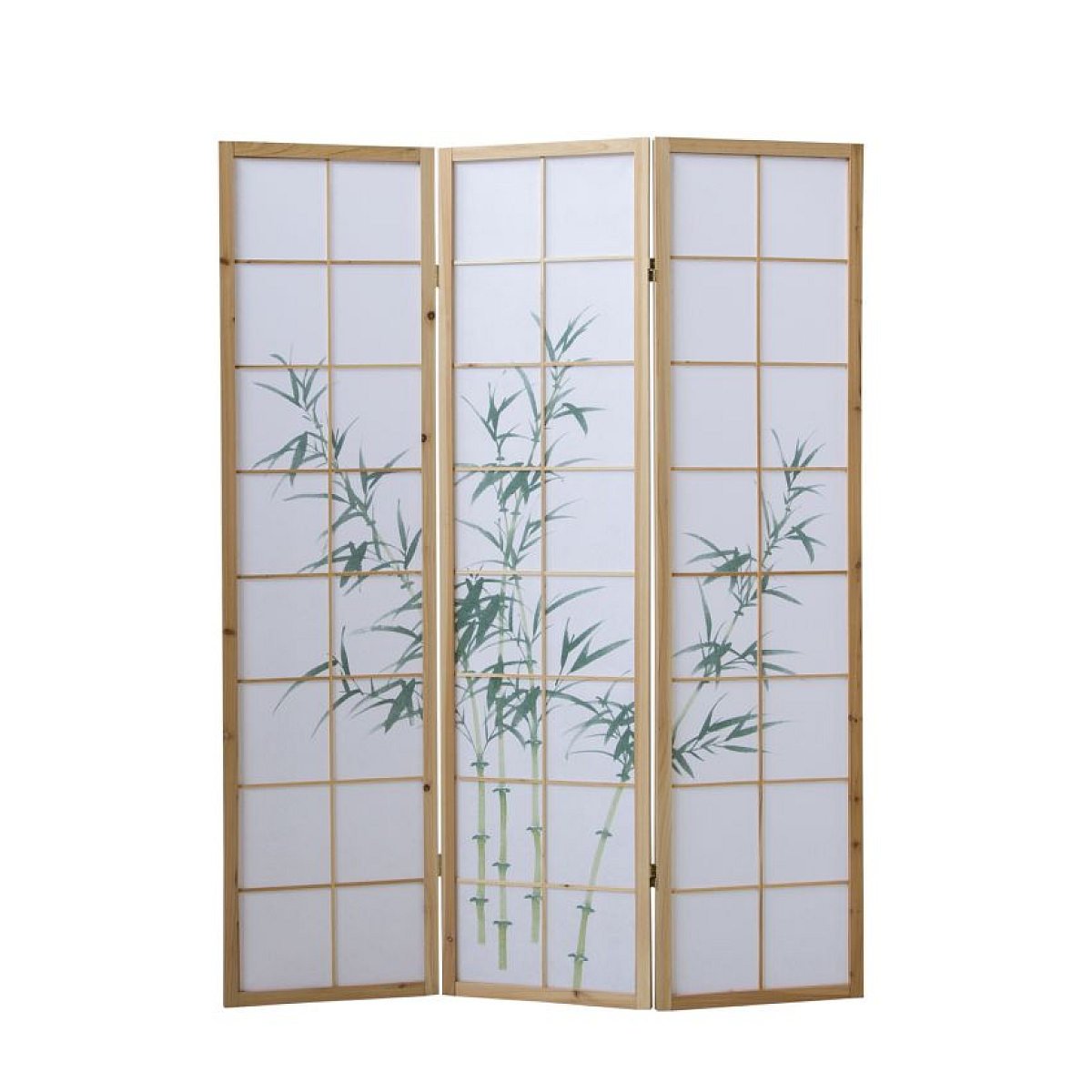 Détails du produit: paravent stable en bois nature en 3 parties Motif bambou en aquarelle sur le devant opaque mais laissant passer la lumière pliable, autoportant, installation flexible charnières orientables dans les deux sens meuble adapté à l'intérieur, p. ex. salon, chambre à coucher ou bureau Matériaux et couleurs: cadre en bois de pin nature intérieur en papier de riz shoji de haute qualité avec des branches de Motif bambou Dimensions: hauteur : 175 cm largeur (déplié) : 132 cm profondeur : 2,0 cm largeur de chaque partie : 44 cm position stable en position inclinée