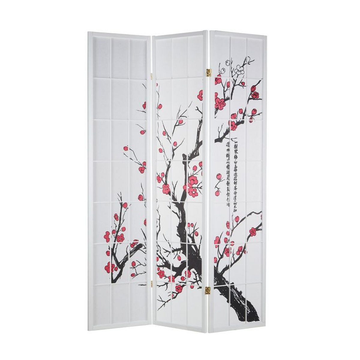 Détails du produit: paravent stable en bois blanc en 3 parties fleurs de cerisier en aquarelle sur le devant les caractères chinois complètent le design Shoji opaque mais laissant passer la lumière pliable, autoportant, installation flexible charnières orientables dans les deux sens meuble adapté à l'intérieur, p. ex. salon, chambre à coucher ou bureau Matériaux et couleurs: cadre en bois de pin blanc intérieur en papier de riz shoji de haute qualité avec des branches de fleurs de cerisier Dimensions: hauteur : 179 cm largeur (déplié) : 132 cm profondeur : 2,0 cm largeur de chaque partie : 44 cm position stable en position inclinée