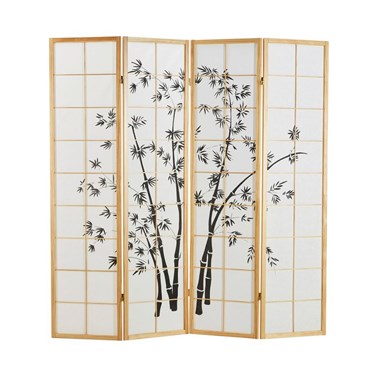 Détails du produit: paravent stable en bois nature en 4 parties Motif bambou en aquarelle sur le devant opaque mais laissant passer la lumière pliable, autoportant, installation flexible charnières orientables dans les deux sens meuble adapté à l'intérieur, p. ex. salon, chambre à coucher ou bureau Matériaux et couleurs: cadre en bois de pin nature intérieur en papier de riz shoji de haute qualité avec des branches de Motif bambou Dimensions: hauteur : 179 cm largeur (déplié) : 176 cm profondeur : 2,0 cm largeur de chaque partie : 44 cm position stable en position inclinée Détails de la livraison: séparateur de pièce en 4 parties, livré entièrement montées