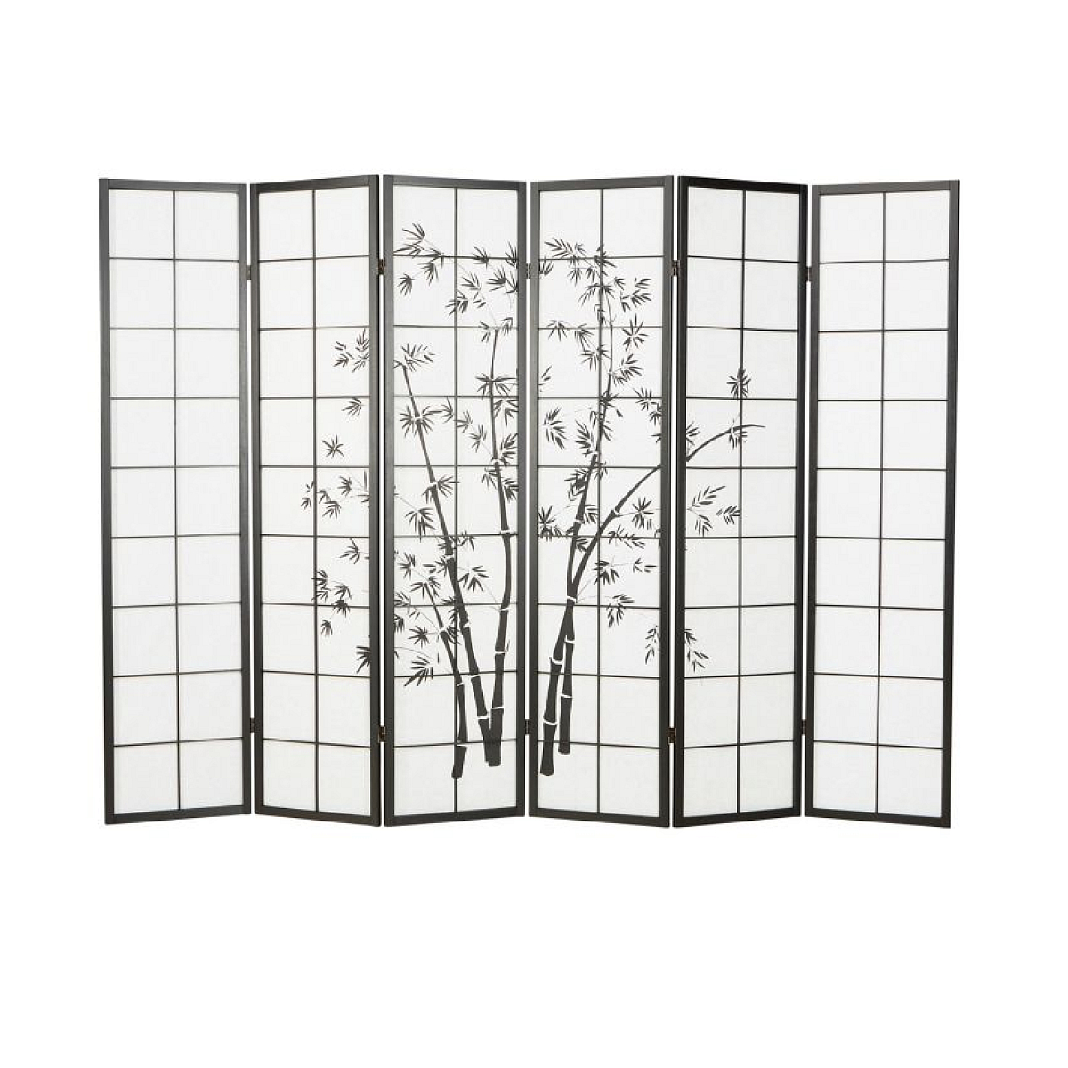 Détails du produit: paravent stable en bois noir en 6 parties Motif bambou en aquarelle sur le devant opaque mais laissant passer la lumière pliable, autoportant, installation flexible charnières orientables dans les deux sens meuble adapté à l'intérieur, p. ex. salon, chambre à coucher ou bureau Matériaux et couleurs: cadre en bois de pin black intérieur en papier de riz shoji de haute qualité avec des branches de Motif bambou Dimensions: hauteur : 179 cm largeur (déplié) : 264 cm profondeur : 2,0 cm largeur de chaque partie : 44 cm