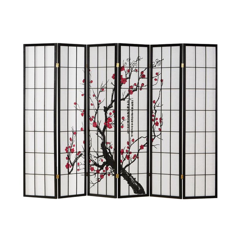 Détails du produit: paravent stable en bois noir en 6 parties fleurs de cerisier en aquarelle sur le devant les caractères chinois complètent le design Shoji opaque mais laissant passer la lumière pliable, autoportant, installation flexible charnières orientables dans les deux sens meuble adapté à l'intérieur, p. ex. salon, chambre à coucher ou bureau Matériaux et couleurs: cadre en bois de pin noir intérieur en papier de riz shoji de haute qualité avec des branches de fleurs de cerisier Dimensions: hauteur : 179 cm largeur (déplié) : 264 cm profondeur : 2,0 cm largeur de chaque partie : 44 cm