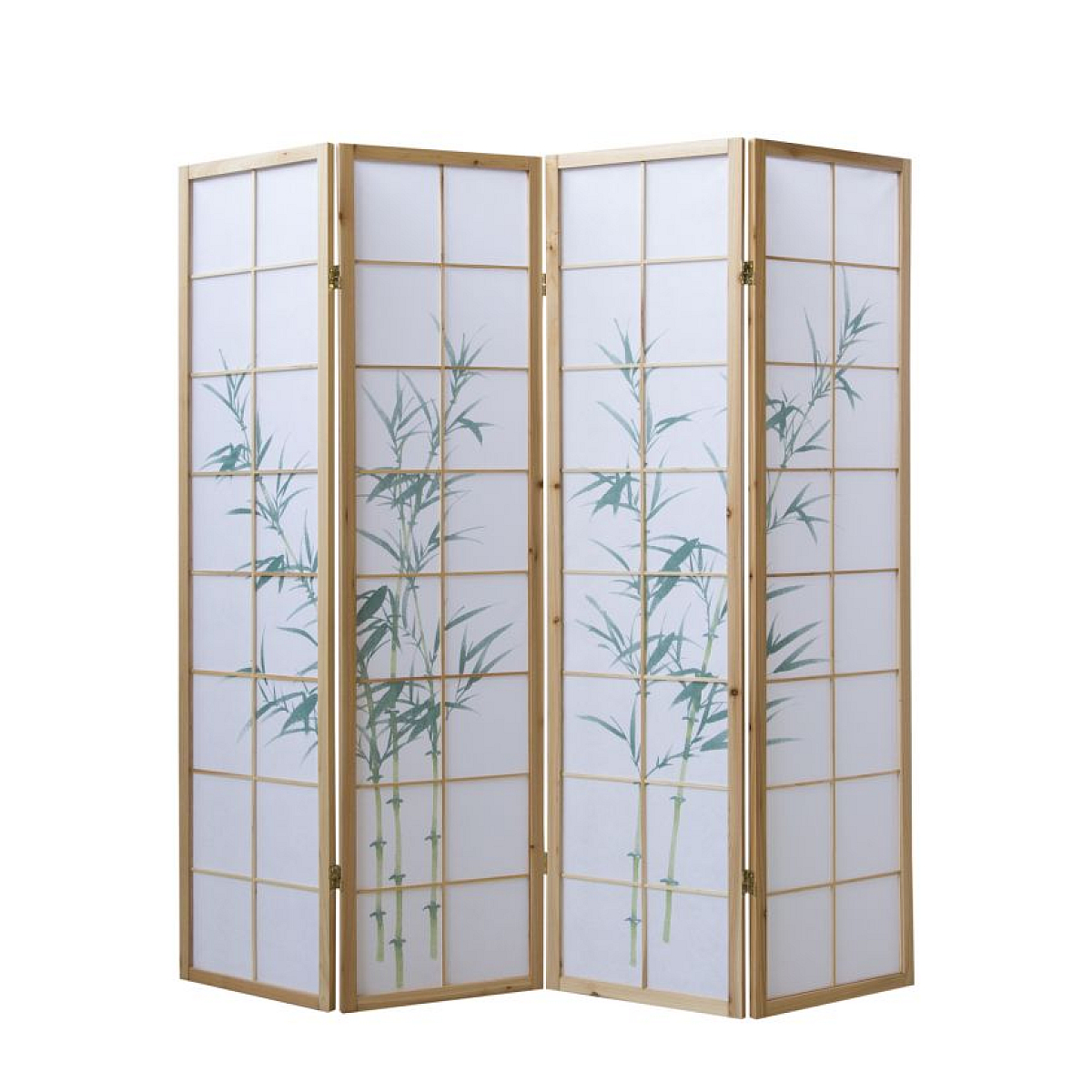 Détails du produit : Paravent à 4 panneaux Pliable, facile à installer Charnières pivotant dans les deux directions Matériaux et couleur : Bois, vernis transparent Papier de riz Shoji blanc avec motif de bambou vert Dimensions : Hauteur : 175 cm Largeur : 176 cm Profondeur : 2,2 cm Largeur des panneaux individuels : 44 cm