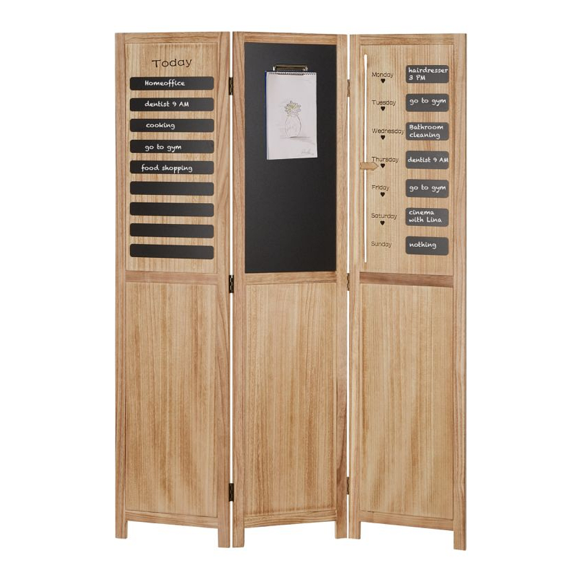 Détails du produit : séparateur de pièce en 3 parties pour le bureau, la cuisine, le salon ou la chambre éléments mémo pratiques, personnalisables à la craie flèche réglable pour indiquer le jour de la semaine fonction presse-papiers pour les notes, les blocs et les mémos pliable, facile à monter convient pour une utilisation en intérieur La livraison est effectuée entièrement assemblée. Matériau et couleur : séparateur de pièce en bois (Paulownia) de couleur naturelle, magnifique grain de bois visible éléments de tableau noir inscriptibles en noir pliable grâce aux charnières couleur : naturelle Dimensions : hauteur : 170 cm largeur : 120 cm profondeur : 2,0 cm largeur de chaque élément individuel : 40 cm