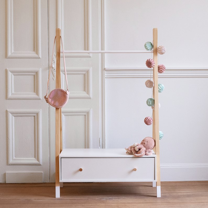 Vous cherchez à aménager la chambre de votre enfant avec des meubles de rangement ? Ce portant vous offre un espace pour suspendre les habits sur cintres et dispose d'un tiroir pour un stockage supplémentaire. Nos petits peuvent ainsi ranger facilement leurs vestes, leurs hauts, leurs pyjamas et leurs sous-vêtements. Le dessus du tiroir peut également être un espace libre pour y mettre de la décoration, des jouets ou de jolis paniers. Avec une structure en bois de pin et des lignes simples, cette penderie pour enfant de style scandinave saura trouver sa place dans n'importe quelle chambre d'enfant. Elle accompagne vos petits au fur et à mesure qu'ils grandissent.