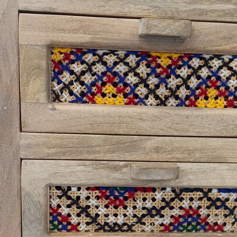 Vous admirerez le cannage multicolore sur la façade de notre table de chevet Massaï 2 tiroirs. Son côté folk et la minutie de sa réalisation ajoutent un dynamisme unique.