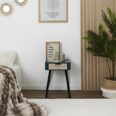 Vous apprécierez le style bicolore de cette table de chevet bleu canard . Son tiroir vous permettra de ranger vos petits effets personnels en toute discrétion.