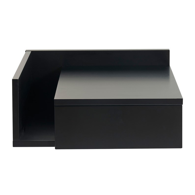 Conçue en deux parties, cette table de chevet à suspendre noire (dimensions L40 x P32 x H16.5 cm) se compose d' un tiroir (L21.5 x P23.5 x H5.5 cm) et d' une niche ouverte (L8.5 xP28.5 x H10.5-15 cm). Parfait pour garder à portée de main une lecture, des lunettes, un réveil et tous vos indispensables avant le coucher et au réveil !