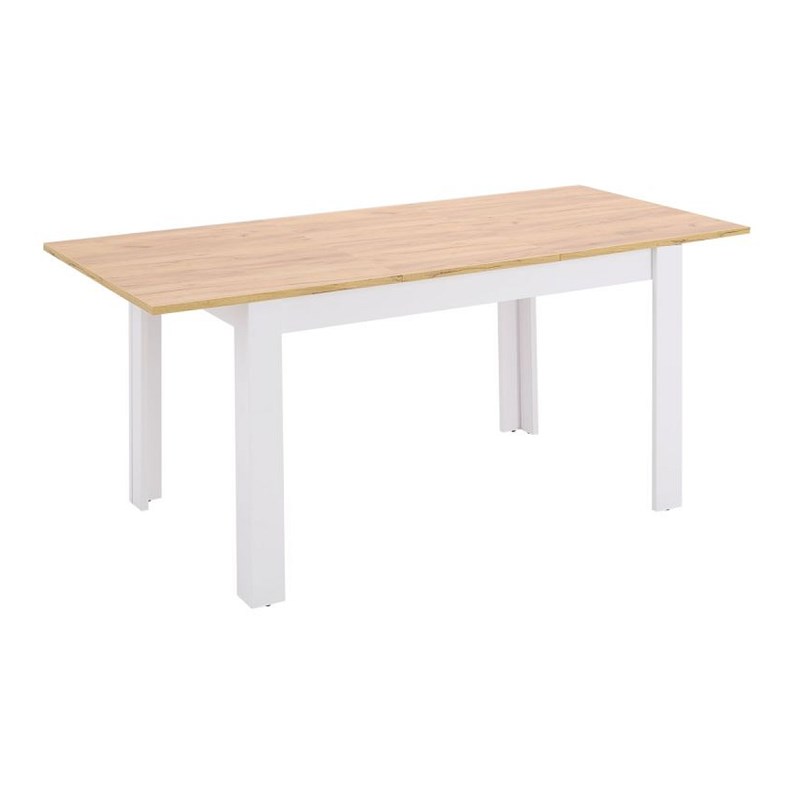 Table en panneau de bois robuste, revêtement décoratif blanc Plateau avec finition aspect chêne Kraft Gold, veinage bien visible Couleur : blanc et naturel Dimensions : Longueur : 135 cm (extensible jusqu'à 184 cm) Largeur : 86 cm Hauteur : 77 cm