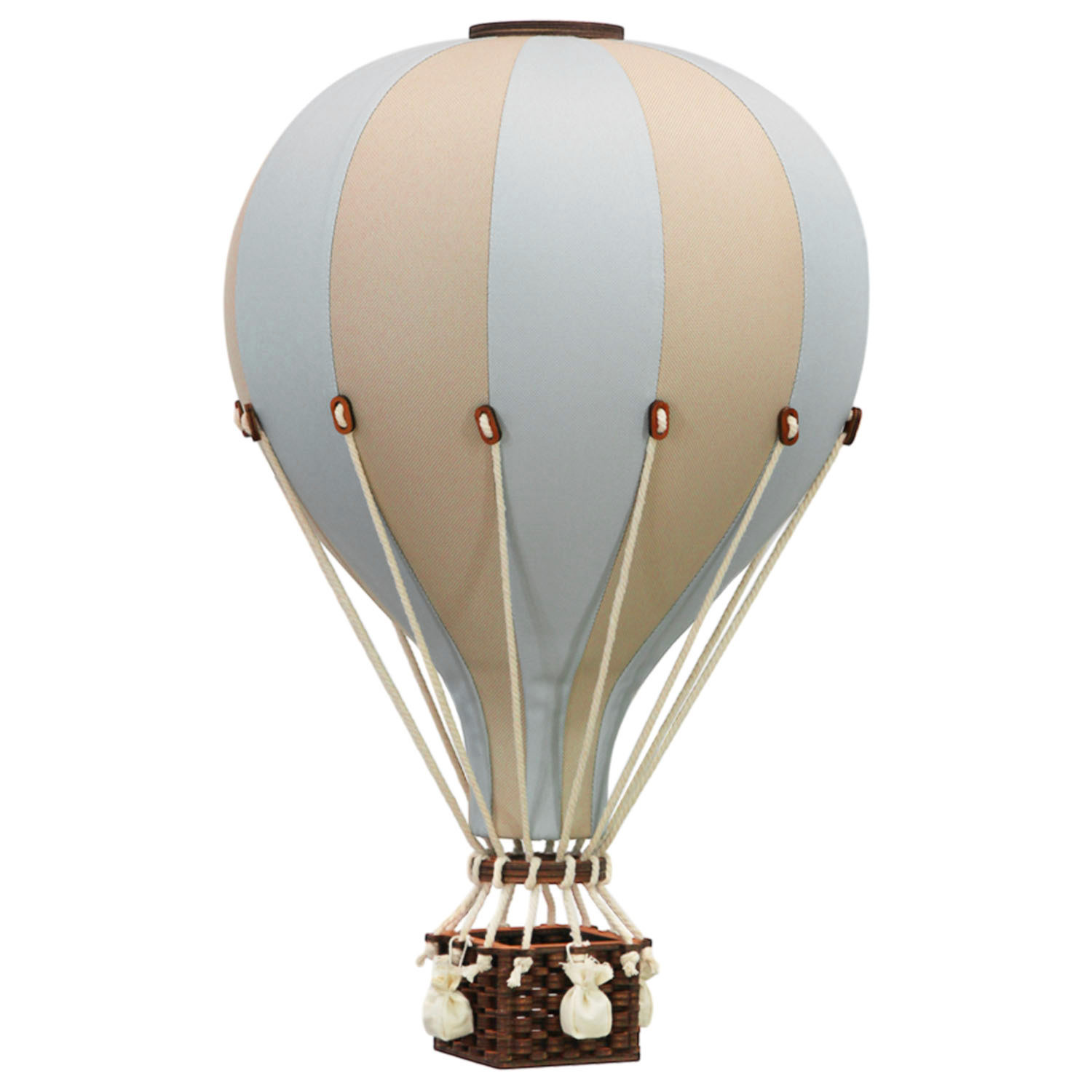 L'enveloppe du ballon est en tissu, disponible dans différents coloris, la nacelle fabriquée en bois et peinte pour conserver l'esprit osier des véritables montgolfières accompagné de petits sacs de sable accrochés autour de la nacelle pour les plus grandes tailles. Les éléments individuels et la fermeture de la valve sur le dessus du ballon sont en bois. Elles contiennent également une attache spécial, en toute transparence, et un crochet adhésif pour pouvoir suspendre votre belle montgolfière dans la pièce de votre choix.Ces montgolfières sont sublimes seules ou associées, sous différentes tailles ou différentes couleurs, elles apporteront une légèreté unique et de la magie à la chambre de votre enfant ! L'univers de bébé se transforme instantanément en quête de nouveaux voyages : idéal pour développer l'imagination et faire de jolis rêves !Une belle idée cadeau qui plaira tout autant aux petits comme aux grands ! Un produit de créateur très original, 100% fait main, aux finitions parfaitement soignées. Un produit de qualité exceptionnelle, à offrir ou à s'offrir, ou à ajouter sur votre liste de naissance. Disponible en 3 tailles : Taille S : Ø 16 cm / hauteur 28 cm Taille M : Ø 20 cm / hauteur 33 cm Taille L : Ø 30 cm / hauteur 50 cmNotes : Ce sont des éléments décoratifs, non des jouets, il est préférable de les manipuler et les utiliser sous la surveillance d'un adulte.