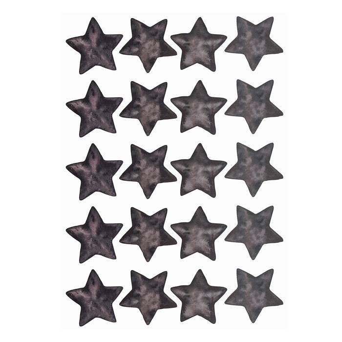 Jolis stickers design noir dont l'illustration a été réalisée à l'aquarelle. Cette planche est composée de 20 stickers étoiles. Sticker repositionnable, sans PVC, très fin pour se fondre au mur et mât pour un effet ""peint directement sur le mur"", pas de brillance. Dimension d'une étoile : 5 cm x 6 cm environ ...