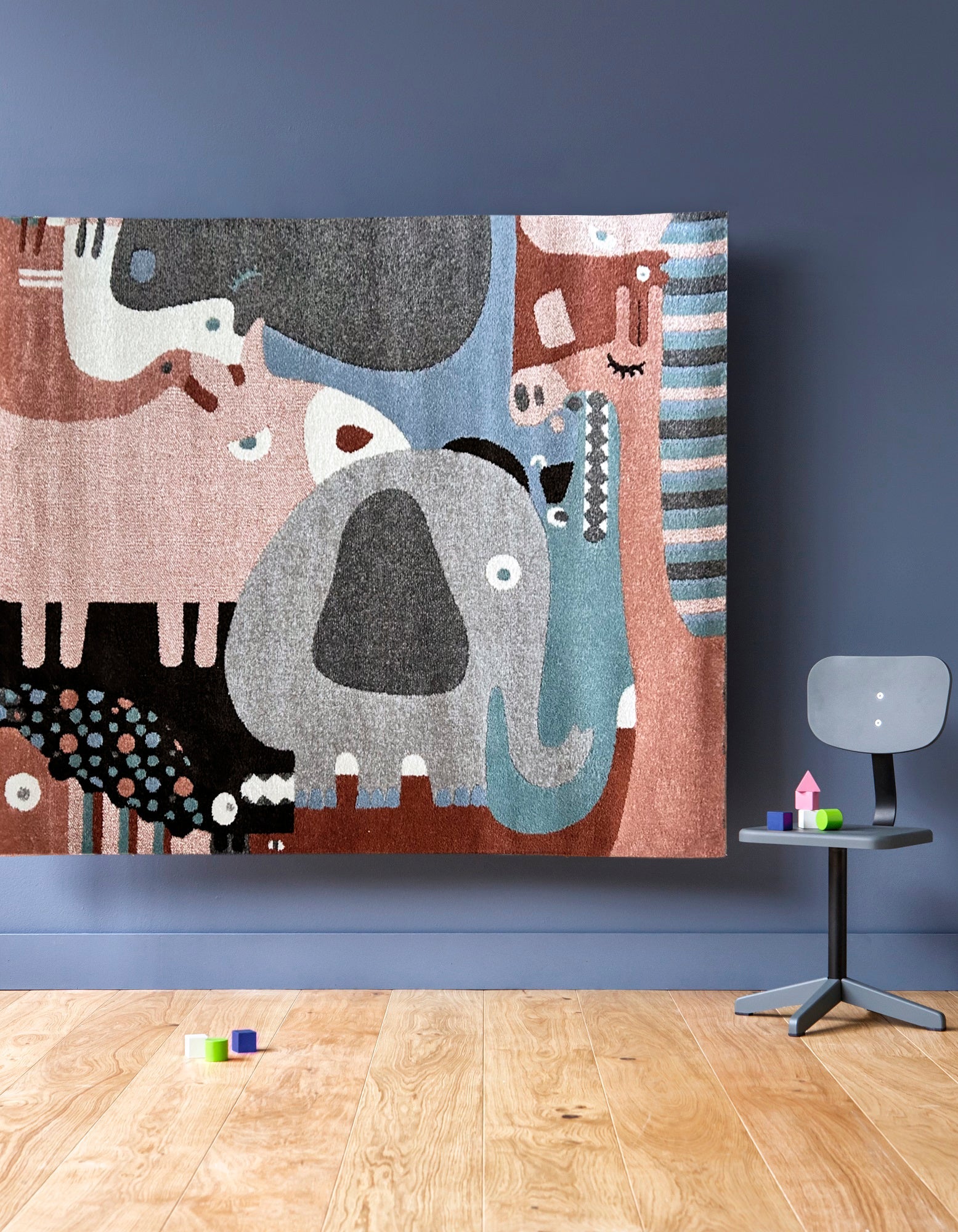 Un tapis ludique avec les animaux de la jungle. Les enfants s'amuseront à reconnaître les animaux imbriqués les uns aux autres dans ce tapis aux couleurs douces.