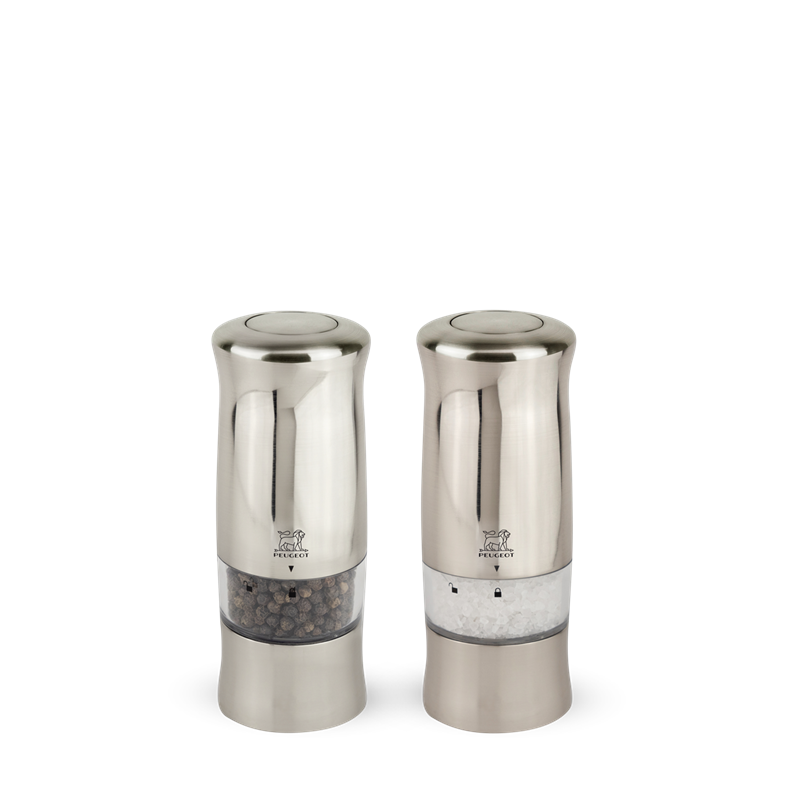 Présenté dans un coffret aux couleurs Peugeot, le duo de moulins électriques à poivre et à sel Zeli se distingue par son habillage façon métal brossé très contemporain. Aussi pratique que performant, ces moulins compacts s'utilisent d'une seule main. Une pression sur le bouton situé au-dessus du moulin suffit pour le mettre en marche. Une lumière s'allume lors de l'utilisation permettant de contrôler le débit de poivre ou de sel. Ils sont proposés avec 6 piles, une ampoule de rechange, ainsi que d'une recharge de poivre noir du Vietnam et de cristaux de sels secs. Enfin, vous pourrez régler la mouture de poivre grâce à une molette située sous le mécanisme du moulin à poivre électrique Zeli. Leur mécanisme est garanti sans limitation de durée, quant à leur moteur, Peugeot s'engage sur une garantie d'une durée de 2 ans.- Référence92062820