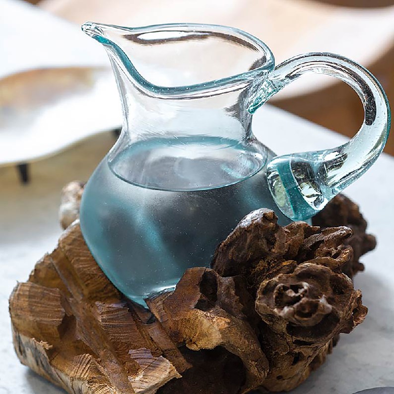 Ce pichet allie élégance et naturel avec son verre soufflé unique posé sur une pièce en teck. Chaque exemplaire est une création artisanale, garantissant une pièce exclusive.