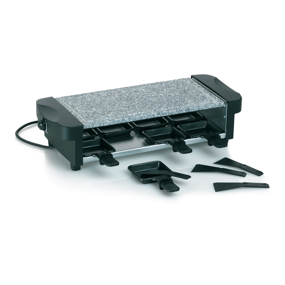 L'appareil de raclette est doté de poêlons antiadhésifs qui permettent de faire fondre votre fromage préféré, tandis que la plaque en granit s'occupe de griller et de cuire les accompagnements.