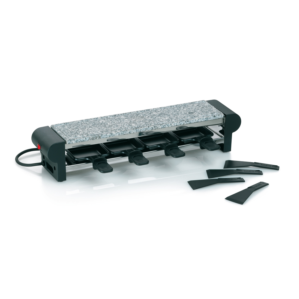 L'appareil de raclette est doté de poêlons antiadhésifs qui permettent de faire fondre votre fromage préféré, tandis que la plaque en granit s'occupe de griller et de cuire les accompagnements.
