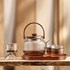 - La théière est accompagnée de deux tasses de dégustation en verre, parées de bois pour les saisir sans se brûler.