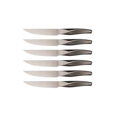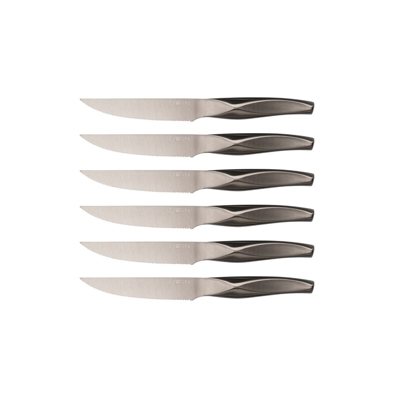 Les couteaux de table LARUS nous emmènent dans une expérience culinaire futuriste. Les six couteaux d'une longueur de lame de 13 cm sont parfaitement adaptés pour savourer vos plats préférés, qu'il s'agisse de viandes, tartes ou plats cuisinés. Ce qui distingue véritablement ces couteaux, c'est le design original et la couleur éclatante aux mille reflets associés à une performance de coupe remarquable. Fabriqués en acier inoxydable de haute qualité et garantis pour durer dans le temps, les couteaux sont adaptés à un lavage au lave-vaisselle. La teinte présente un effet brossé qui apporte une esthétique moderne et fascinante, les faisant ressortir dans n'importe quelle situation. Les lames parfaites et tranchantes associées aux reliefs géométriques du manche permettent une prise en main ergonomique et un confort absolu lors de la découpe, faisant de chaque instant de dégustation un véritable plaisir.