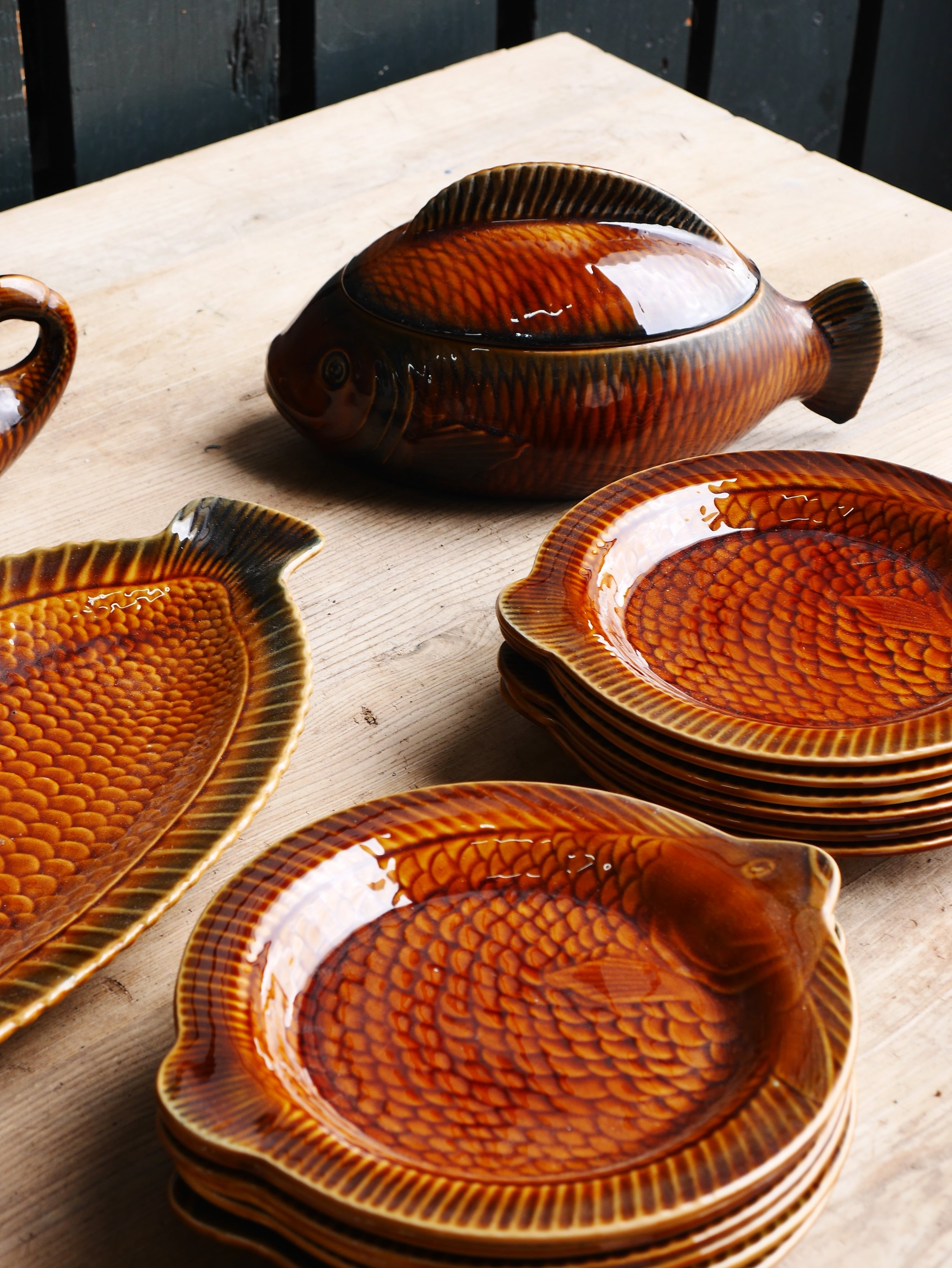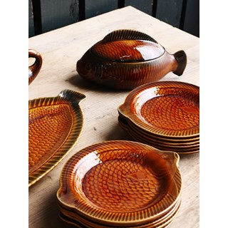 Idéal pour sublimer vos repas autour des produits de la mer, ce service apportera une touche vintage et conviviale à vos grandes tablées. Les assiettes à poisson, le plat de service et la soupière deviennent les complices parfaits pour dresser une table à la fois raffinée et pleine de personnalité. Mais au-delà de l’art de la table, ce service en faïence Sarreguemines peut aussi être exposé dans un vaisselier ou suspendu en décoration murale, où il attirera immédiatement le regard des amateurs de pièces anciennes.