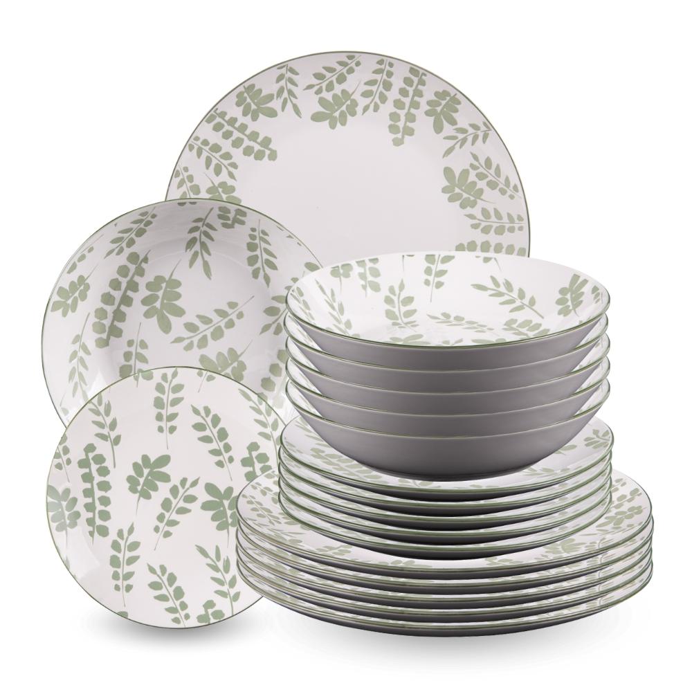 Ce service se compose de 6 assiettes plates de 27 cm, 6 assiettes creuses de 20 cm et 6 assiettes à dessert de 19 cm.