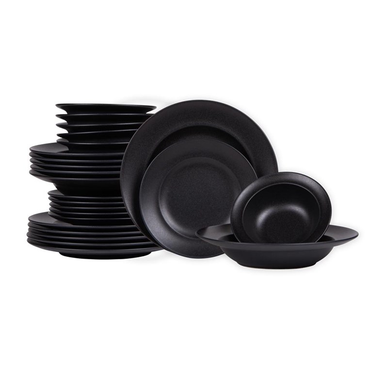 Ce service comprend 6 assiettes plates 28 cm, 6 assiettes creuses 19 cm, 6 assiettes à pâtes 29 cm et 6 assiettes à dessert 22 cm.