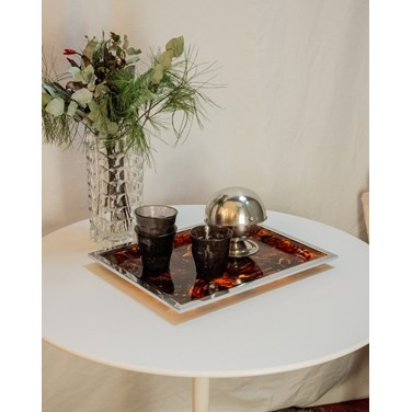 Sublimez votre table ou votre bar avec ce plateau en lucite et chrome au décor écaille de tortue, où la transparence dialogue avec la lumière pour créer une présence discrète mais sophistiquée. Son fond marron et translucide varie selon la surface sur laquelle il repose, offrant des reflets chauds qui magnifient verres, flacons et objets déco. L'association de la lucite douce et du métal lumineux apporte un équilibre entre modernité et allure couture, idéal pour organiser vos soins ou dresser un coin convivial avec élégance. Excellent état.