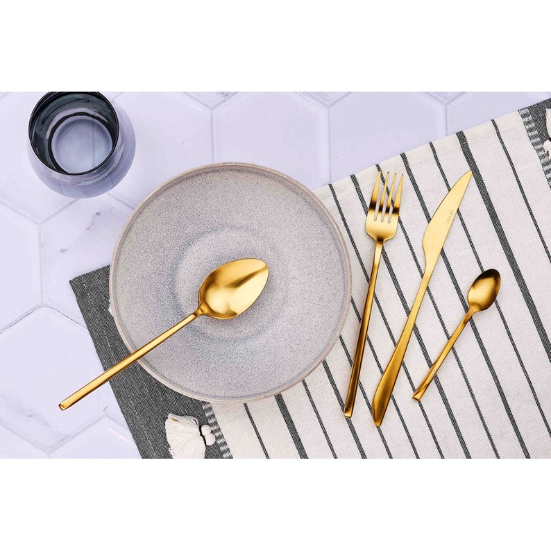 Fabriqué en acier inoxydable pour résister à une utilisation quotidienne, ces couverts sont durables et d'un entretien facile au lave-vaisselle. Dans sa version de couleur dorée avec une finition mate, ce modèle à l'effet miroir chic et éclatant illuminera votre table et étonnera vos convives.