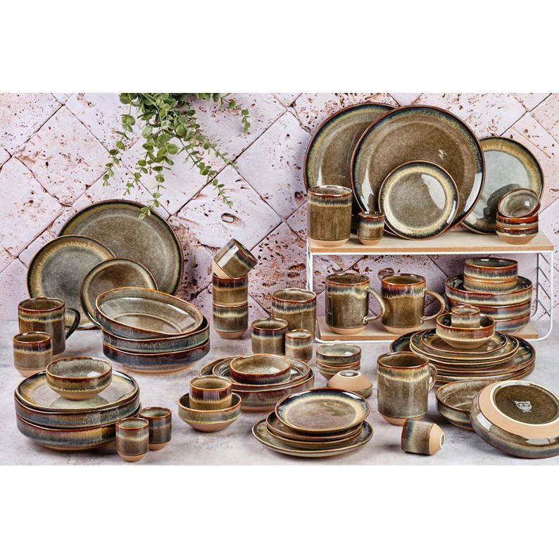 Après une première cuisson de l'argile à basse température, des émaux réactifs de couleurs différentes s'appliquent sur le grès et lui donnent un relief unique et éclatant. L'apparatition de nuances de teintes que l'on retrouve d'une pièce à l'autre est le résultat d'un savant mélange artisanal des techniques de cuisson et du mode d'application de l'émail.