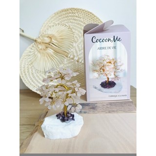 D'une hauteur de 13cm, cet arbre est fabriqué avec des pierres naturelles couleur quartz rose, améthyste et ses branches sont en laiton doré.