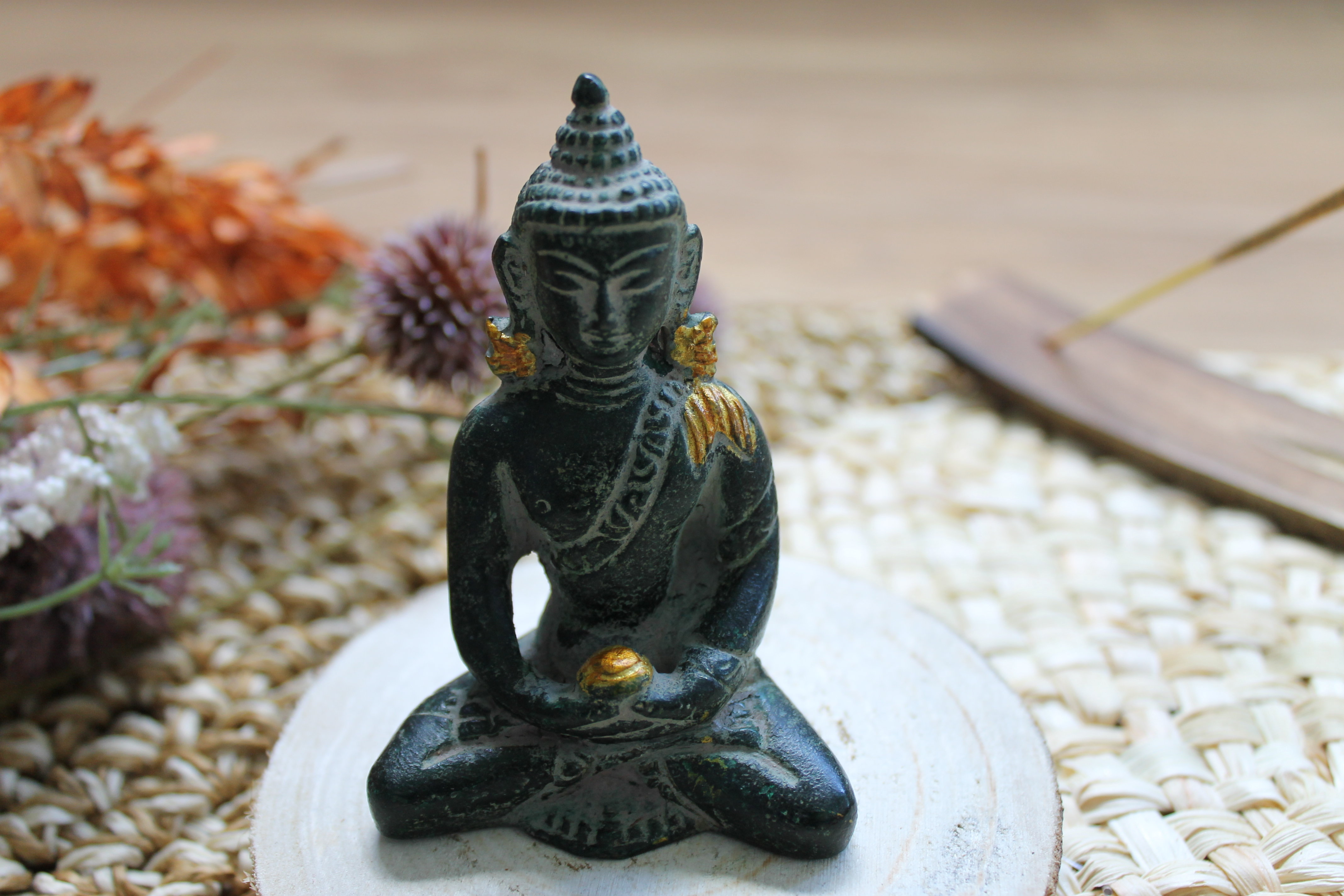 Statuette Bouddha Dhyana mudra en laiton vert antique 7,5 cm Omsaé