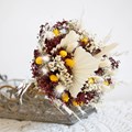 La structure des palmes blanches situées au centre, tranchent avec la délicatesse et la rondeur des fleurs du gypsophile blanc et du broom bordeaux. Le phalaris jaune illumine l'ensemble. Les plumes blanches du lagurus donnent un peu de douceur tandis que les tiges d'avoine apportent un effet champêtre à ce bouquet de fleurs séchées.