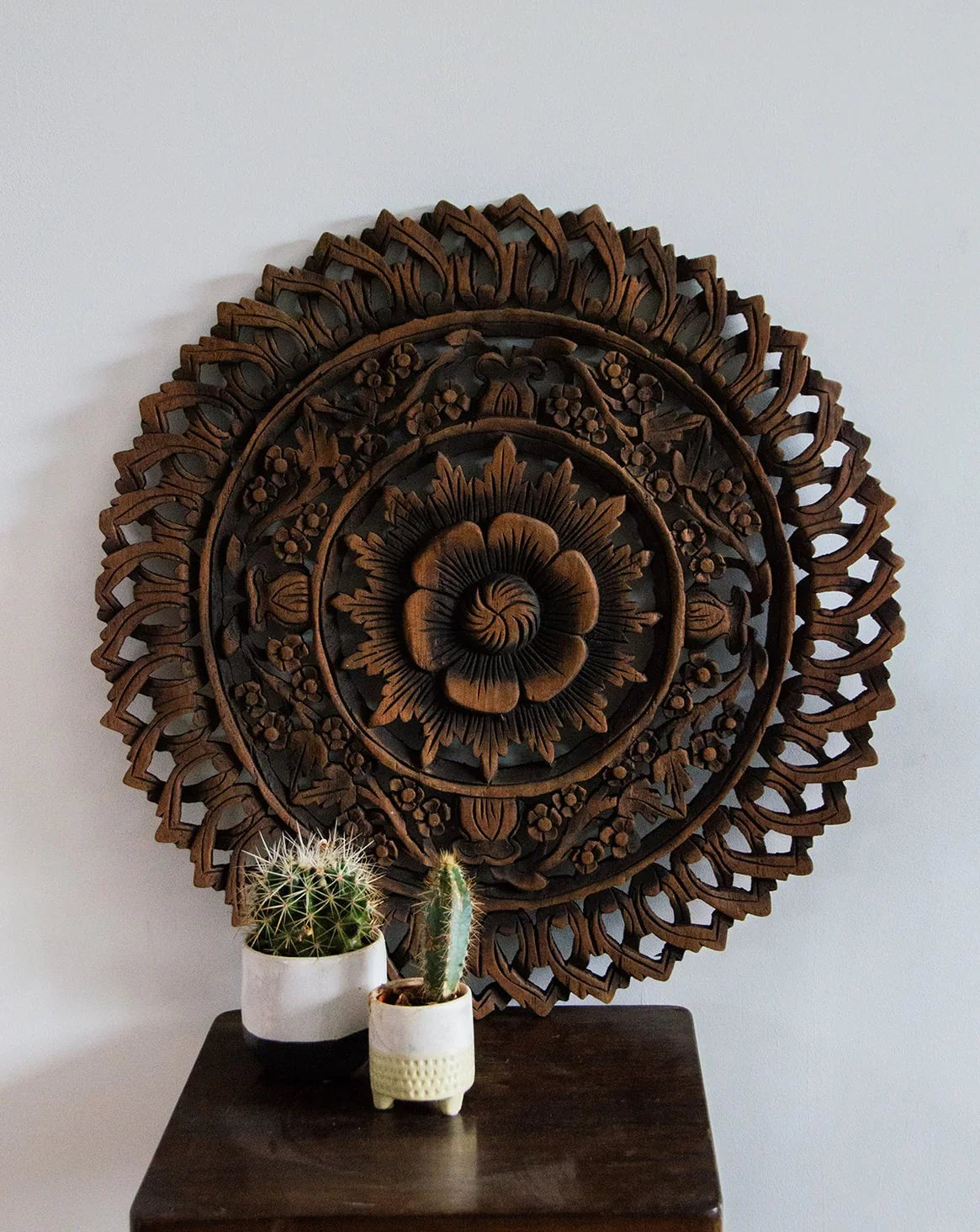 Apportez une touche d'élégance naturelle à votre intérieur avec notre décoration murale ronde en bois sculpté. Ornée d'une délicate fleur centrale, cette pièce artisanale sublime avec grâce vos murs tout en ajoutant une dimension chaleureuse à votre décoration. Chaque détail est soigneusement travaillé, faisant de cet objet un véritable atout esthétique et unique pour votre chez-vous. Ideal pour sublimer un salon, une chambre ou un hall d'entrée, laissez-vous séduire par son charme authentique.