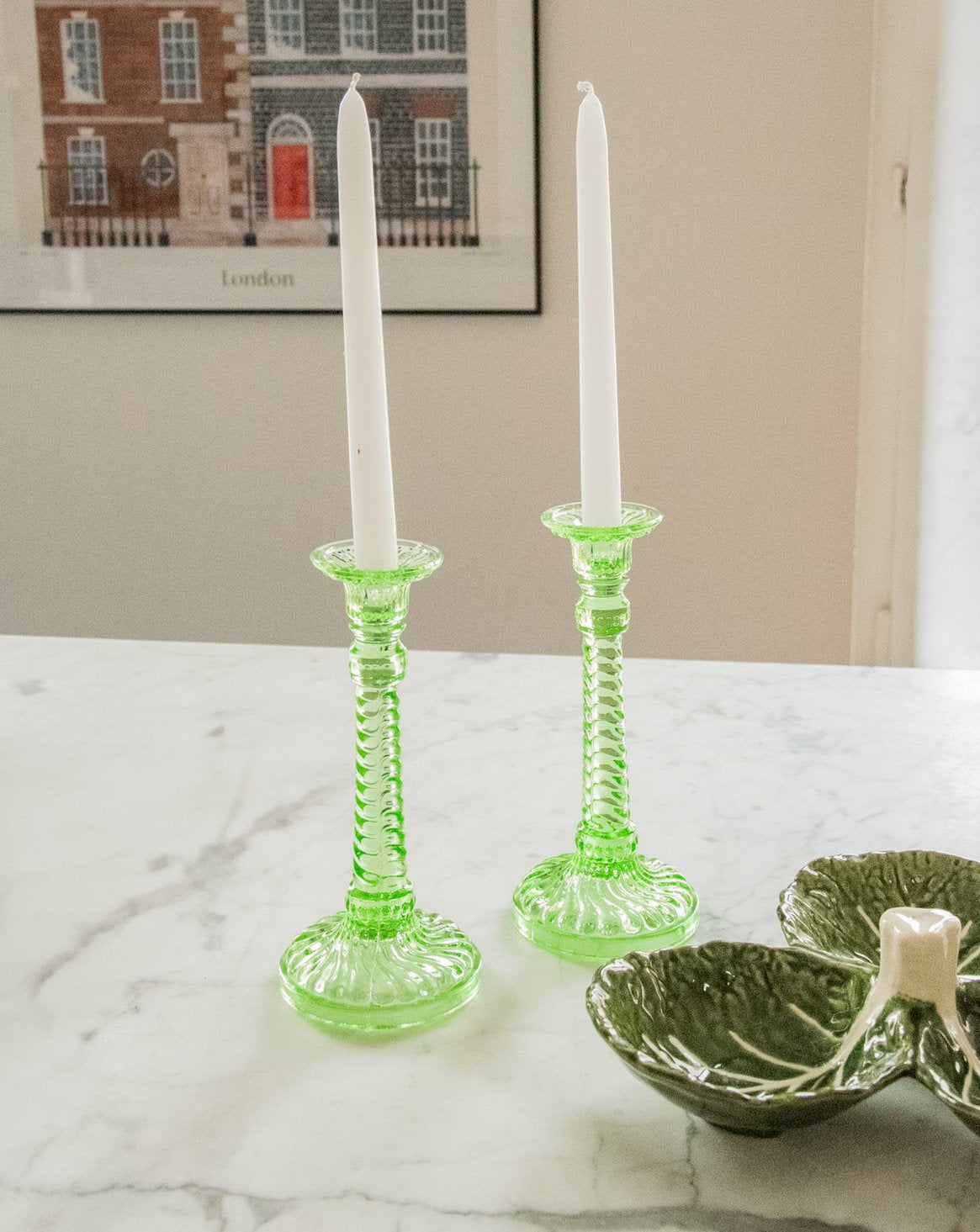 Découvrez ces deux bougeoirs en cristal vert signés Scailmont, issus de la verrerie belge des années 1920-1930, au charme ancien discret. Leur silhouette élancée et leur base stable mettent en valeur la pureté du cristal et accueillent des bougies fines pour une lumière douce et tamisée. Idéals sur une table de dîner, une cheminée ou une console, ils apportent une note art déco raffinée et chaleureuse à l'intérieur. En excellent état, sans accroc.