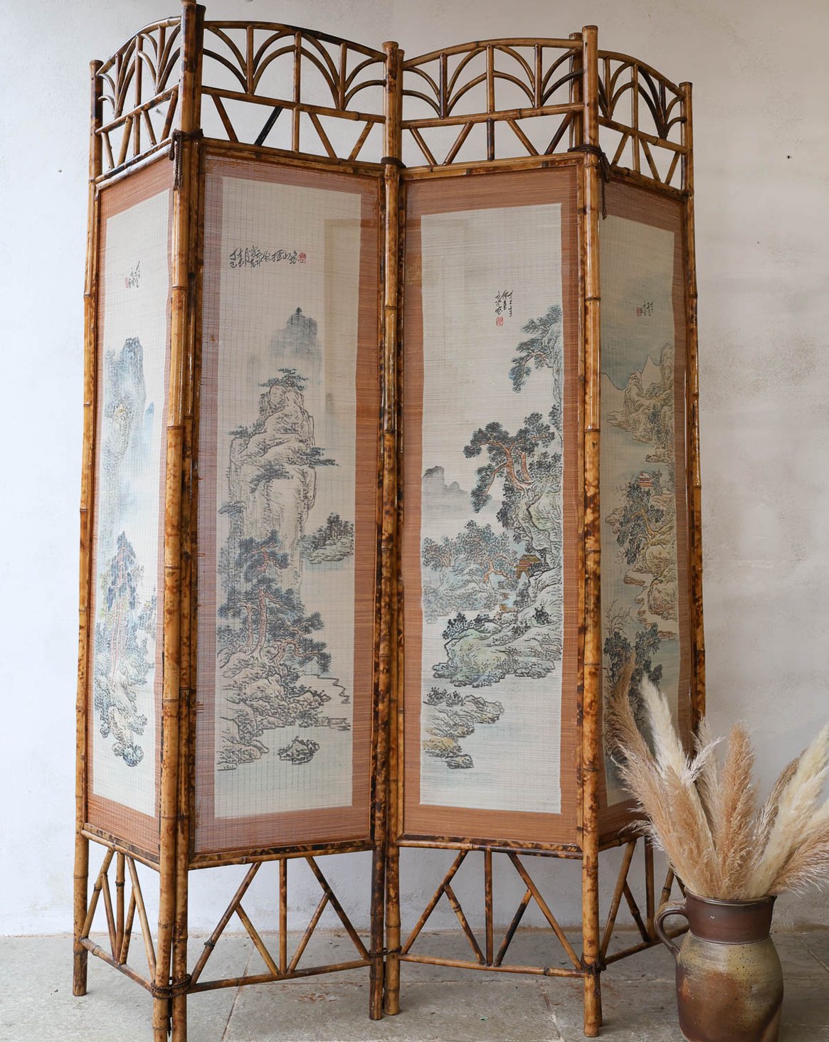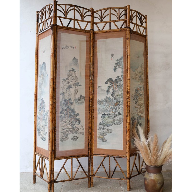 Invitez un air d'inspiration japonisante avec ce paravent ancien en tissu natte et rotin, composé de quatre panneaux qui rythment l'espace. La toile tressée et l'armature en rotin apportent une douceur tactile et une esthétique naturelle, tandis que ses proportions hautes offrent une présence discrète et sculpturale. Idéal pour délimiter une pièce, créer un coin intime ou servir de fond décoratif, il se replie de façon compacte pour un rangement facile.