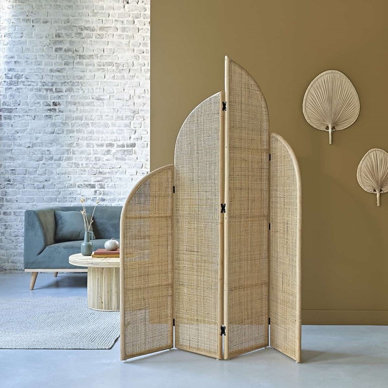 Ce paravent en rotin et cannage vous laissera sans voix. Nous adorons son design, ses courbes et sa teinte claire naturelle. Il dispose de 4 panneaux tressés et est repliable. Caractéristiques : Matière : Rotin - Couleur : Naturel - Largeur : 120 cm - Profondeur : 30 cm - Hauteur : 170 cm - Poids : 5 kg - - Particularité : Le paravent ne peut pas être totalement déplié - Garantie : 5 ans - Montage : Livré monté. Les + : Rotin naturel – Style bohème – Repliable.