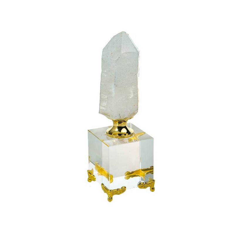 Superbe objet de décoration avec cette pointe de cristal reposant sur un support. Selon les traditions Feng Shui, le cristal attire les énergies positives dans une maison. Le pouvoir du cristal tient au fait que cette pierre très pure capte la lumière et la renvoie. Aussi, placer des cristaux chez soi attire les bonnes énergies selon ces traditions. Accompagnée de son support, cette pointe de cristal, véritable bloc naturel, adopte une forme verticale, comme si la pierre venait tout juste d'être extraite et taillée. Placé sur une table ou un bureau, votre pointe de cristal créera une ambiance aussi douce que relaxante. Objet de décoration peu ordinaire, ce bloc de cristal harmonisera les énergies dans votre foyer. ATTENTION : La pointe étant en cristal naturel, et de fabrication artisanale, chaque modèle est unique par sa taille, sa forme ou son diamètre ainsi que par les taches et inclusions que possède forcément un cristal naturel. La photo de présentation est donc non contractuelle et sert donc uniquement à vous présenter l'aspect du produit. Matière du bloc de cristal : pointe de cristal naturel, support cristal synthétique. Dimensions du bloc de cristal : Hauteur totale variable en 14 et 20 cm - Support 5,5 cm de hauteur, 5 cm de largeur, 5 cm de profondeur. Couleur du bloc de cristal : transparent.
