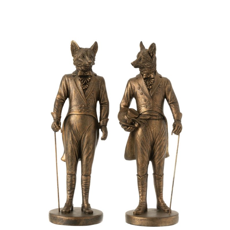 Découvrez ce magnifique set de deux renards gentleman en résine, une pièce d'art unique qui apportera une touche d'élégance et de sophistication à votre intérieur. Chaque renard, mesurant 15x12.5x41.5 cm, est finement sculpté et recouvert d'une finition bronze qui lui confère un aspect à la fois classique et moderne. Ces renards, avec leur posture noble et leur allure distinguée, sont parfaits pour orner une étagère, une cheminée ou un bureau. Leur design raffiné et leur attention aux détails en font un choix idéal pour les amateurs d'art et de décoration. Que ce soit pour ajouter une note de charme à votre salon ou pour offrir en cadeau à un être cher, ce set de renards gentleman est sûr de captiver l'attention et de susciter l'admiration. Laissez-vous séduire par leur allure majestueuse et leur présence imposante qui transformeront n'importe quel espace en un lieu de raffinement et de style.