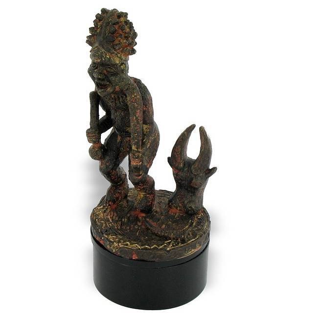 Joli statuette africaine sur socle représentant un chasseur africain avec une tête de buffle appartenant à la tribu Baoulé. Le socle permet le rangement de petits objets. Les Baoulés sont un peuple de Côte d'Ivoire, datant du 18ème siècle. Ils sont originaires du Ghana. Guidés par leur Reine Abla Pokou, les Baoulés ont fui le Ghana. Durant la fuite et le passage du fleuve menant le peuple Baoulé vers la libération, la Reine perd l'un de ses fils, d'où l'expression Ba ou li qui signifie 'l'enfant est mort'. Matière du ''chasseur fétiche africain Baoulé' : polyrésine. Dimensions du ''chasseur fétiche africain Baoulé' : 22 cm de hauteur, 9 cm de longueur. Couleur du ''chasseur fétiche africain Baoulé' : imitation bois polychrome.