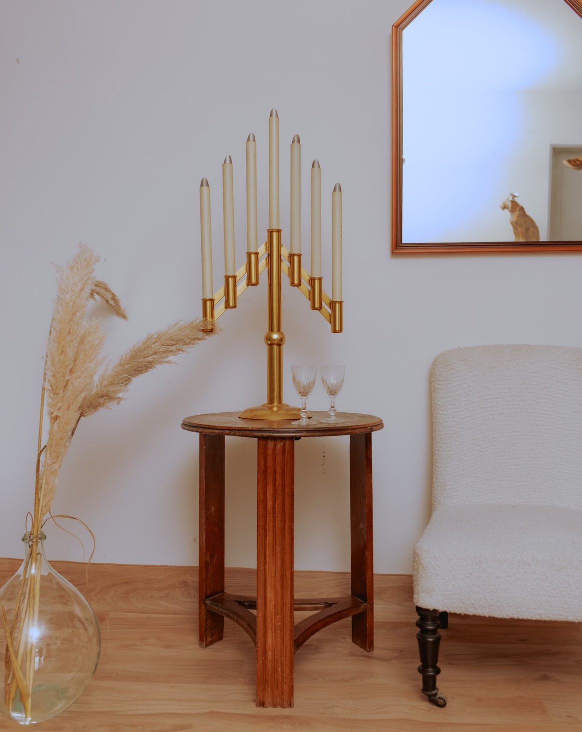 Découvrez ce chandelier en métal doré à sept supports de bougies, où un fût imitant la bougie blanche dialogue avec des reposoirs argentés pour un contraste délicat. Pensé pour animer une table ou sublimer une cheminée, ou encore une console, il diffuse une lumière chaude et crée une atmosphère élégante et intimiste. Son équilibre vertical et sa capacité à accueillir plusieurs bougies en font un point focal raffiné pour dîners et cérémonies. Réglable en hauteur, légères traces du temps présentes.