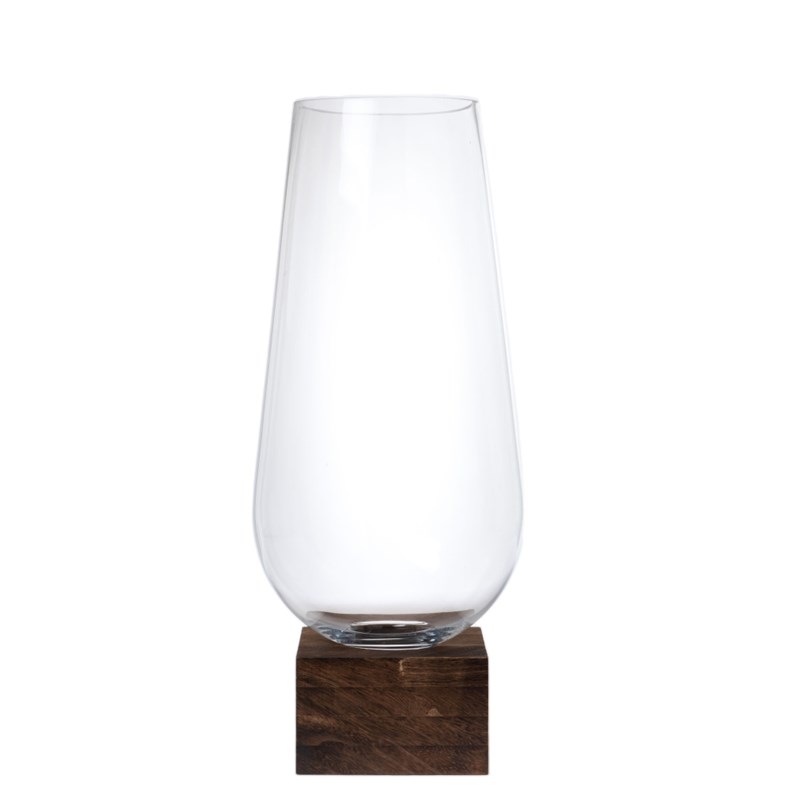 Le vase Maoke repose sur un socle en bois qui apporte une touche chaleureuse et naturelle à l'ensemble. Sa transparence laisse apparaître le jeu subtil des fleurs ou des feuillages que vous y disposerez, pour un effet visuel saisissant.